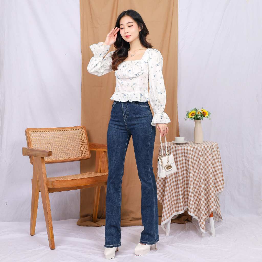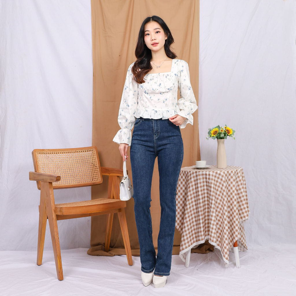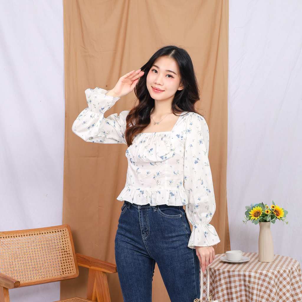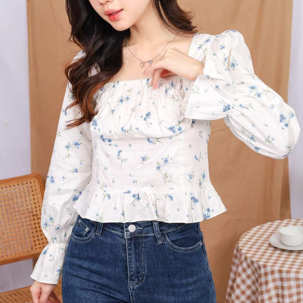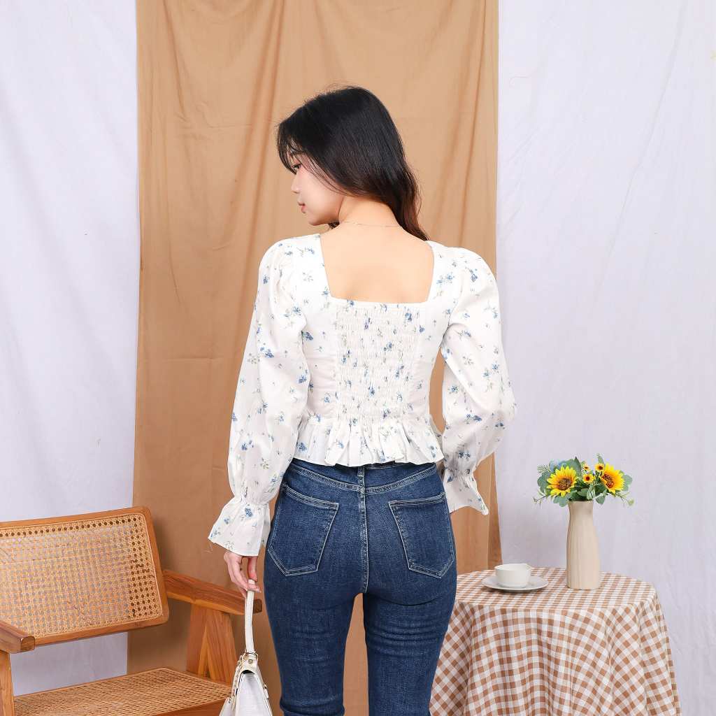 Model : Square collar, elastic straps at chest, back and cuffs, ruffle trim at sleeve ends and bottom of blouse.