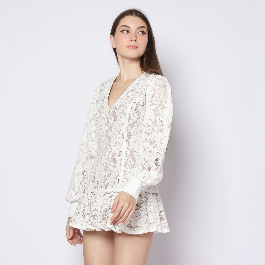 “Turn heads in our Open-Back Mini Dress, a dreamy blend of femininity and charm. Crafted from delicate lace fabric, this dress features a flattering V-neckline, elegant bishop sleeves, and a playful flounce hem for that perfect flowy finish.