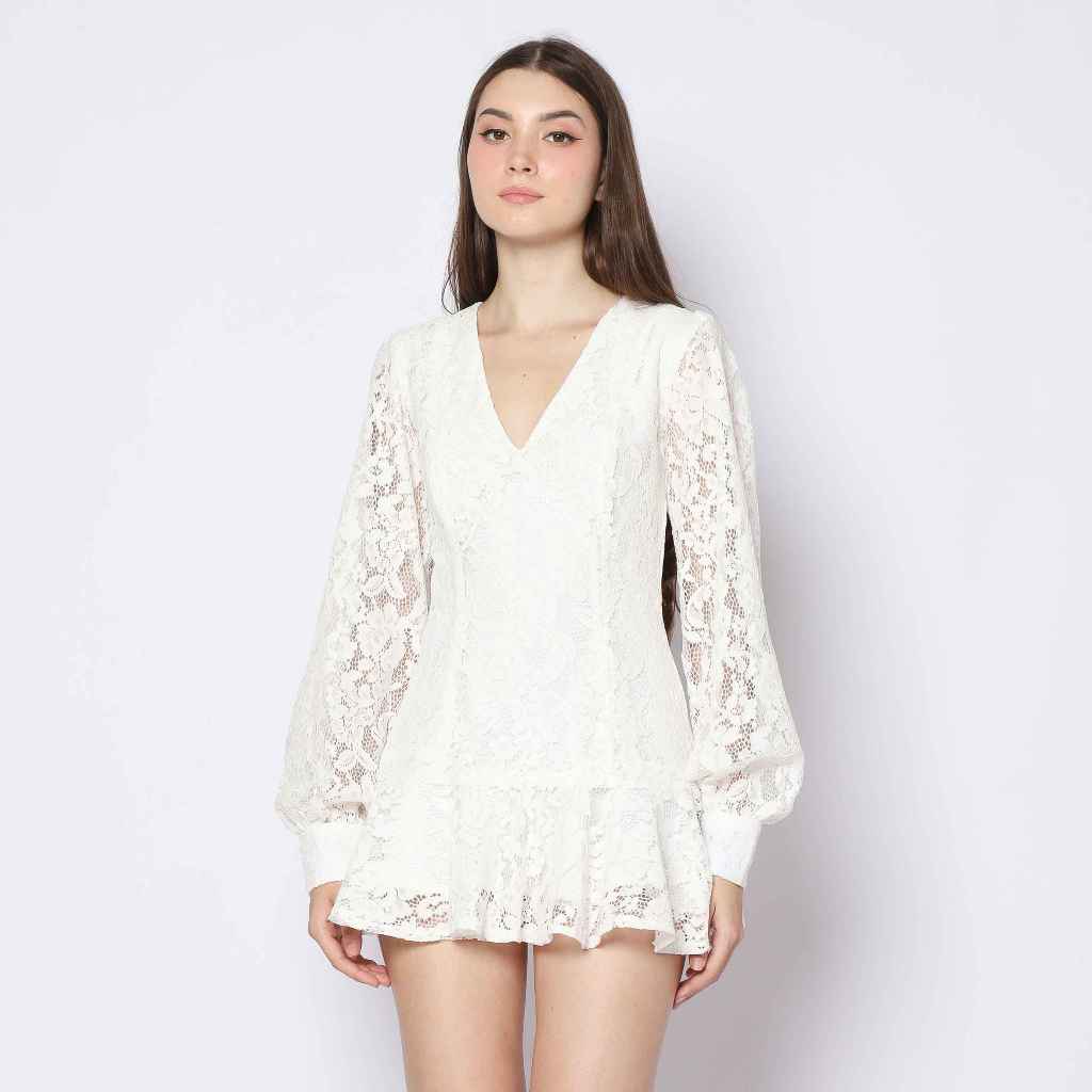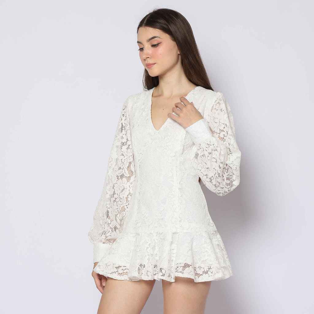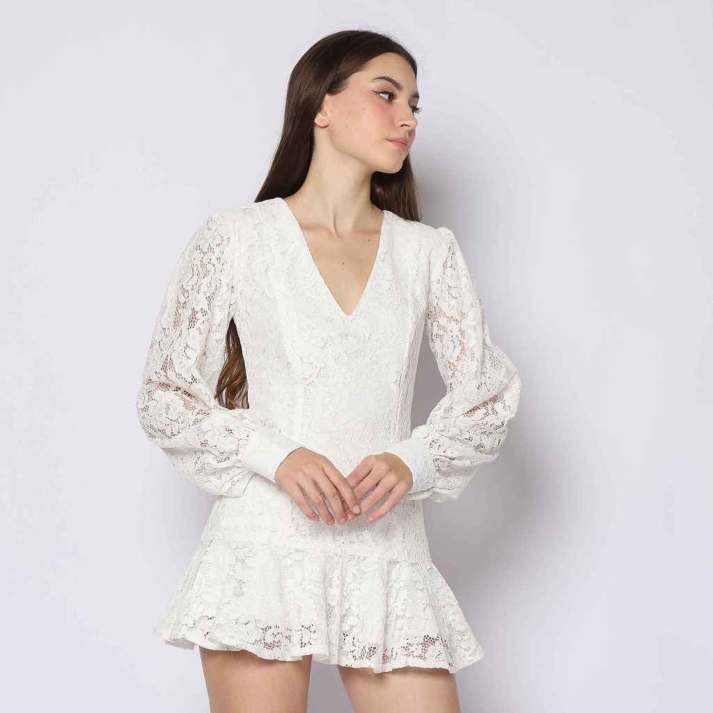 “Turn heads in our Open-Back Mini Dress, a dreamy blend of femininity and charm. Crafted from delicate lace fabric, this dress features a flattering V-neckline, elegant bishop sleeves, and a playful flounce hem for that perfect flowy finish. The open-back detail adds a touch of allure, making it an unforgettable statement piece for any occasion.
