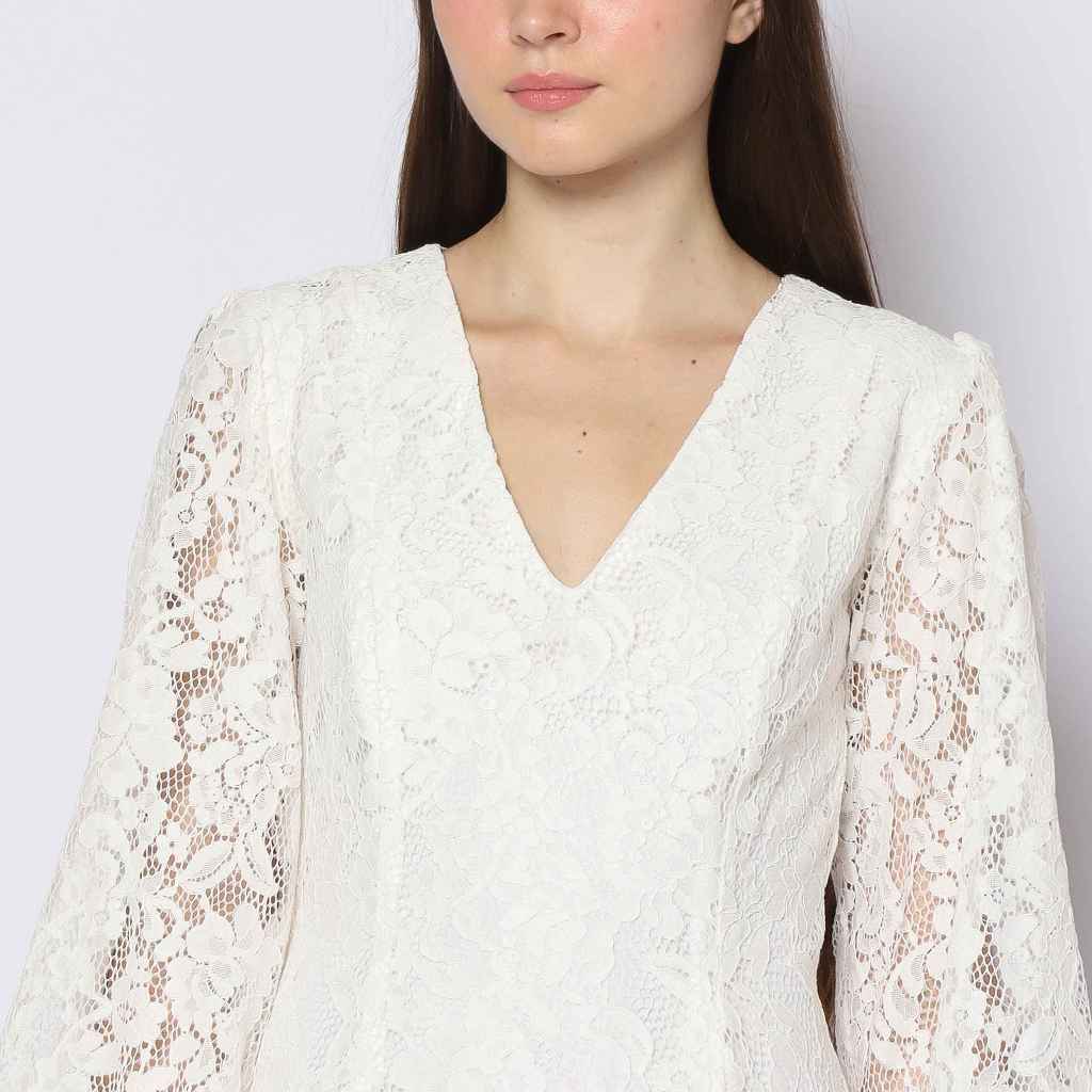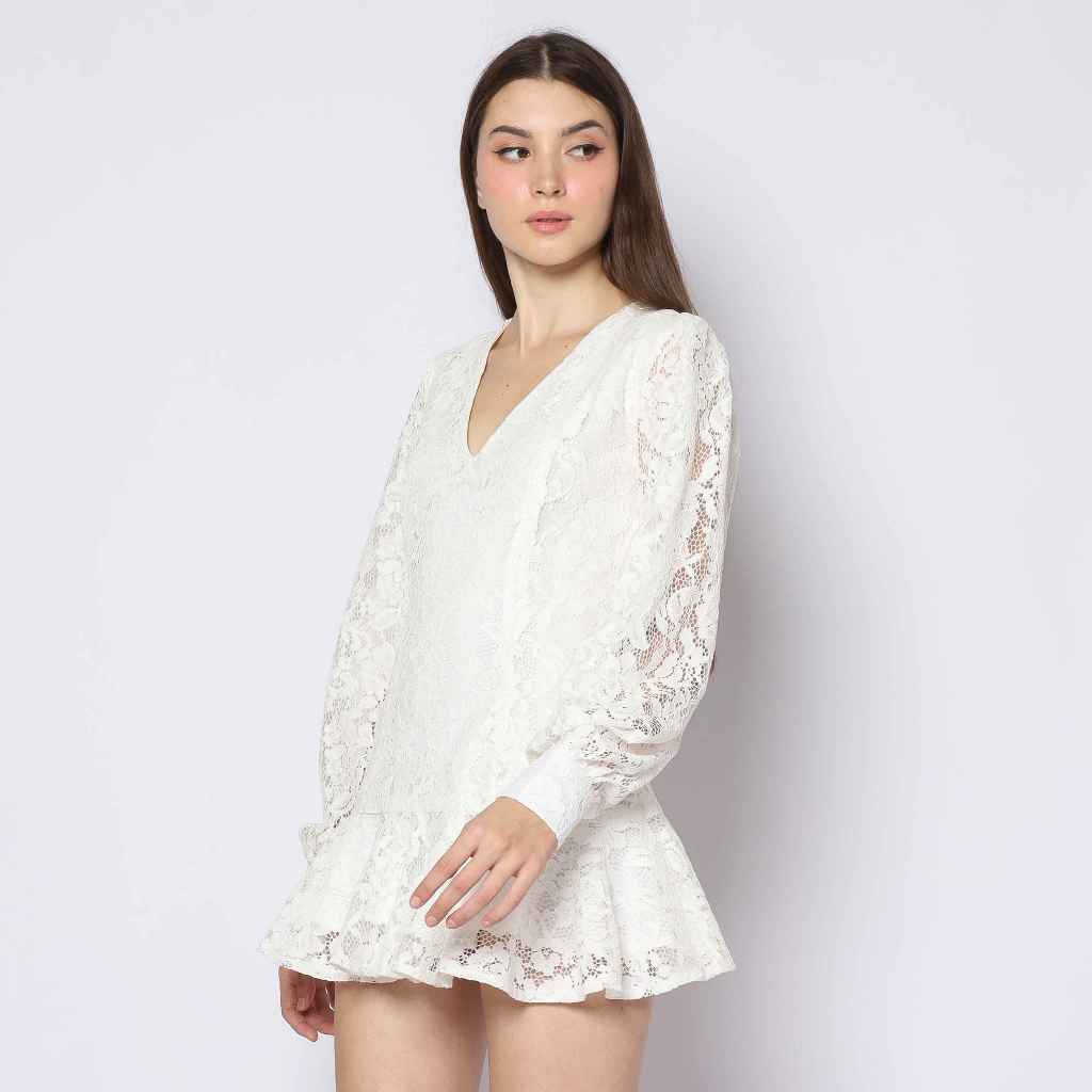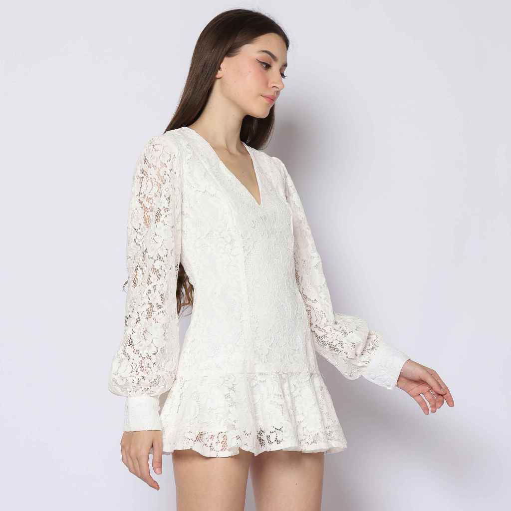 “Turn heads in our Open-Back Mini Dress, a dreamy blend of femininity and charm. Crafted from delicate lace fabric, this dress features a flattering V-neckline, elegant bishop sleeves, and a playful flounce hem for that perfect flowy finish. The open-back detail adds a touch of allure, making it an unforgettable statement piece for any occasion.